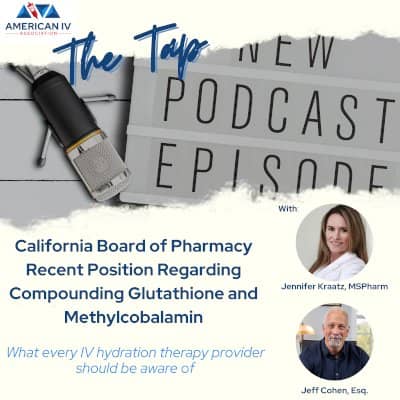 Recently the CA Board of Pharmacy’s (BOP) filed a complaint against La Vita Compounding Pharmacy for compounding sterile preparations with Glutathione and Methylcobalamin. This complaint and what is happening with California Compounding Regulations should be taken seriously as they may have nationwide implications that every IV hydration therapy provider should be aware of.