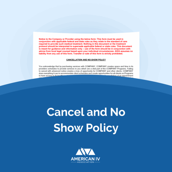 This form outlines the policies and procedures for managing cancellations and no-shows at your IV therapy clinic. It includes terms for required notice periods, cancellation fees, and patient consent for billing charges.