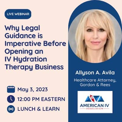 The IV hydration therapy industry is exploding with mobile practices, franchises, add-ons to existing practices and so much more. With regulations varying state to state, multiple boards to be compliant of, federal regulators, and changes to existing regulations happening – don’t open a business without first knowing the laws regulating the business and be certain your employees have the proper training. Join special guest, healthcare attorney Allyson Avila, Justin Puleo, and Jason Kalkirtz as they shed some light on some of the most frequently asked questions our IV providers are asking: